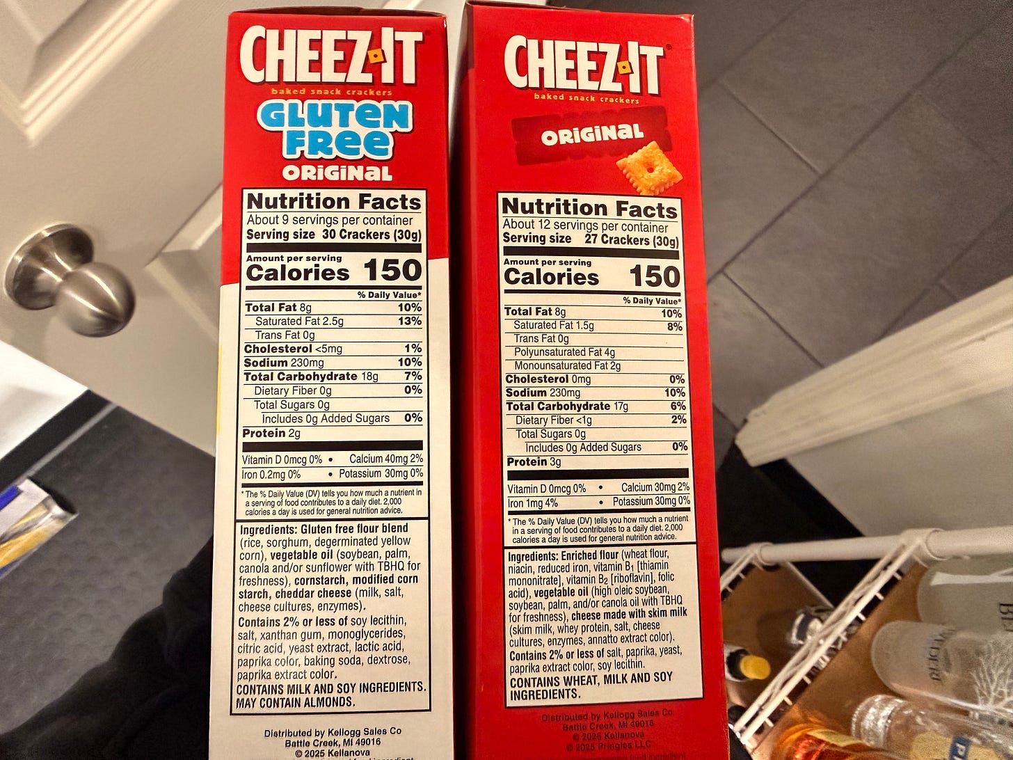 By now maybe you’re wondering what’s in the original Cheez-It’s? The ingredients appear almost farm-to-table in comparison. (Kidding.) Enriched flour, which is enriched because they remove everything good in wheat and then they put back in the nutrients. Vegetable oil, the same terrible stuff in the g-free version; and that TBHQ stuff. The rest is basically fine. So what gives? This is called food science and it probably took Kellenova years to perfect the “recipe” for these crackers. Is anyone looking at these ingredients? Or wondering why no one can say for sure that this stuff isn’t good for us?